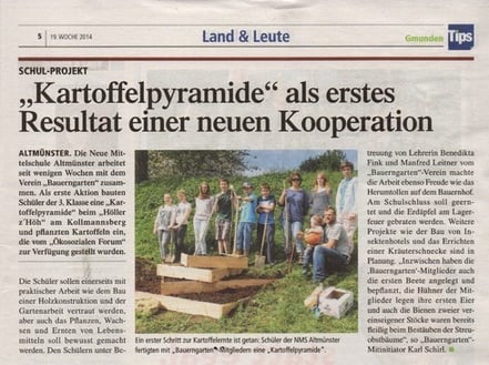 Als erste Aktion 2014 bauten Schüler/innen der 3. Klasse eine „Kartoffelpyramide“ und pflanzten die Kartoffeln ein, die vom „Ökosozialen Forum“ zur Verfügung gestellt wurden. Die Schüler/innen sollen einerseits mit praktischer Arbeit wie dem Bau einer Holzkonstruktion und der Gartenarbeit vertraut werden, aber auch Pflanzen, Wachsen und Ernten von Lebensmitteln soll bewusst gemacht werden. Den Schüler/innen unter Betreuung von Frau Dipl. Päd. Benedikta Fink und Herrn Manfred Leitner vom Verein machte die Arbeit durchaus Freude, aber ebenso das Herumtollen auf dem Bauernhof. Weitere Projekte wie der Bau von Insektenhotels und die Errichtung einer Kräuterschnecke wurden umgesetzt.